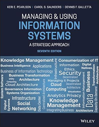 Managing and Using Information Systems: A Strategic ~ Managing and Using Information Systems: A Strategic Approach, 6th Edition. Authors: Keri E. Pearlson, Carol S. Saunders, Dennis F. Galletta. ISBN: 9781119244288. This text is written to help managers begin to form a point of view of how information systems will help, hinder and create opportunities for their organizations. Purchase in either E-Text or binder form form $60 on Wiley Direct.